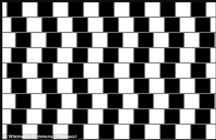 Një iluzion i njohur është edhe Café Wall, i përshkruar nga Prof. Richard Gregory në 1979. Kur pllakat e zeza dhe të bardha vendosen në mënyrë të zhdrejtë me njëra-tjetrën, truri percepton se rreshtat horizontalë janë të pjerrët.