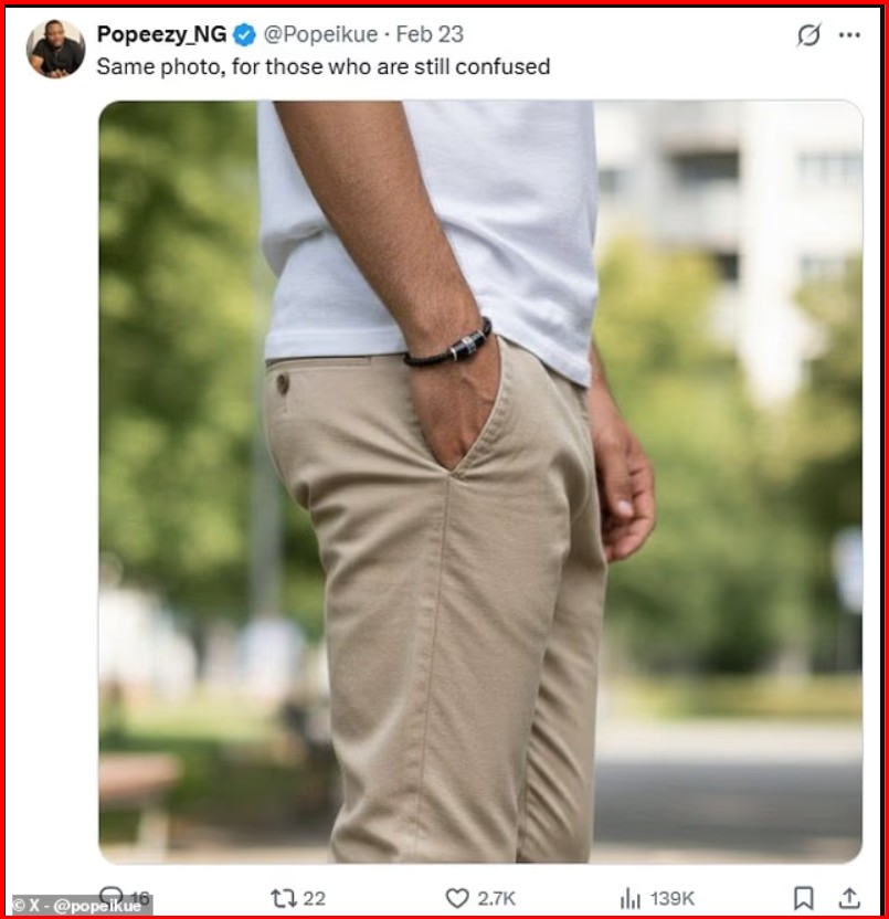 Përdoruesi @popeikue arriti të gjejë një foto më të gjerë të burrit me të njëjtin veshje, ku duket qartë dora e tij në xhep, gjë që e zbuloi iluzionin.