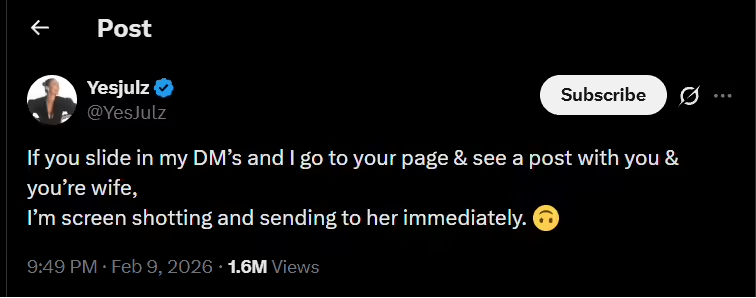 Ajo ishte shumë e drejtpërdrejtë me postimin e saj në “X” më 9 shkurt: “Nëse më shkruani në DM dhe hyj në profilin tuaj e shoh një postim me ju dhe gruan tuaj, do bëj screenshot dhe do ia dërgoj menjëherë asaj. Nuk më intereson as nëse sapo keni fituar Super Bowl. Ka ardhur koha që njerëzit të kenë moral”.