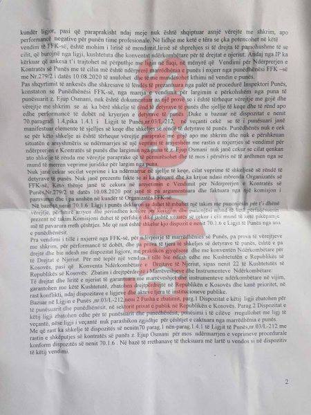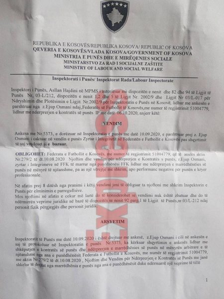 Në vendimin e Inspektoratit të Punës, që e ka siguruar Gazeta Express, thuhet se FFK-ja obligohet që ta anulojë vendimin për ndërprerjen e një anshme të punës pa e pasur asnjë vërejtje ndaj të punësuarit të saj apo fakt që dëshmon se Osmani ka pasur performance negative në të cilën ka mundur të mbështetet shkarkimi. Sipas këtij vendimi, largimi nga puna i Ejupi Osmanit përmban shkelje të Ligjit të Punës nga ana e FFK-së.