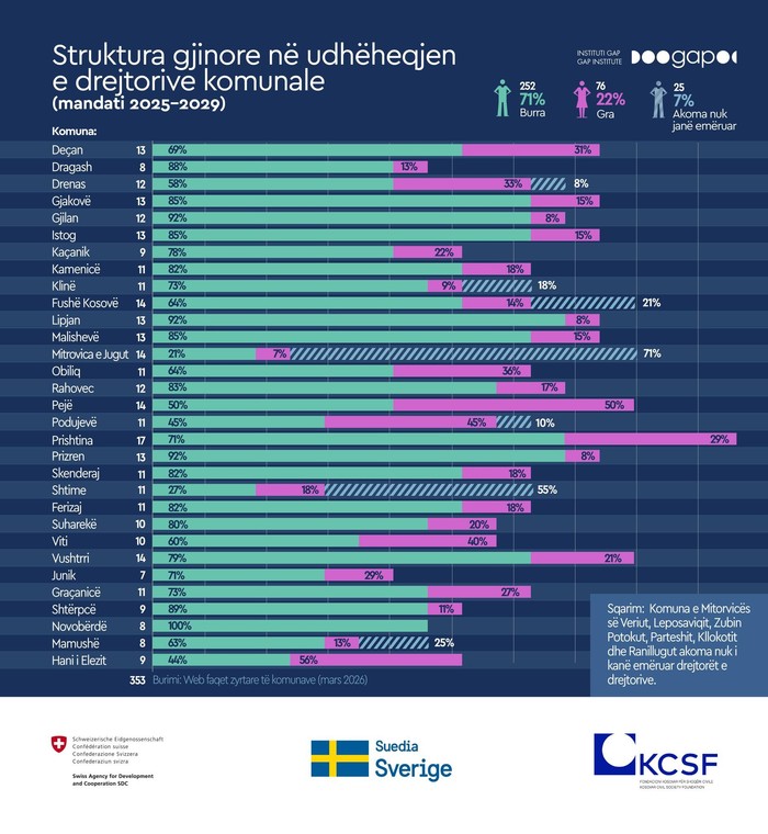 Sipas të dhënave të mbledhura në fillim të mandatit 2025–2029, vetëm 22% e drejtorive komunale udhëhiqen nga gra, ndërsa 71% drejtohen nga burra.