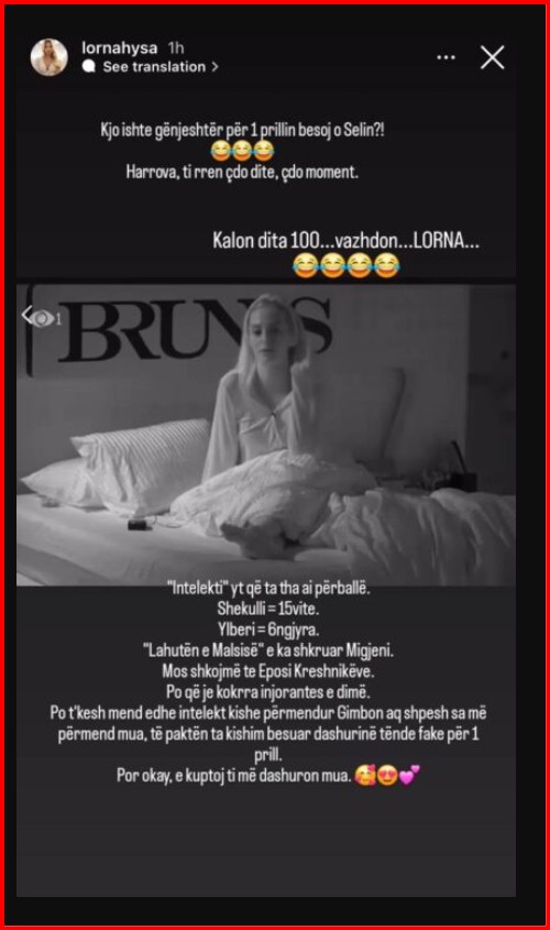 “Kjo ishte një gënjeshtër për 1 prillin besoj o Selin?! Harrova, ti rren çdo ditë, çdo moment. Kalon dita 100… vazhdon… Lorna…”.