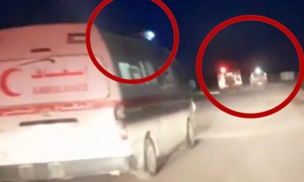 Karvani i ambulancave të Shoqatës së Gjysmëhënës së Kuqe Palestineze (PRCS), një makinë e OKB-së dhe një kamion zjarrfikës nga Mbrojtja Civile e Gazës u përfshinë nga zjarri pranë Rafahut.