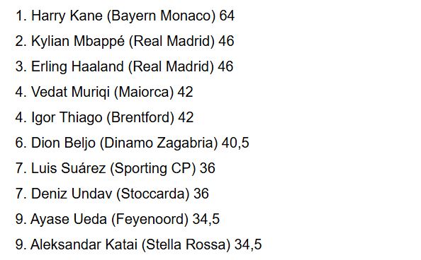 Vendi i katërt është rezervuar për yllin kosovar, Vedat Muriqi, i cili i ka shënuar 21 gola, dy më pak se dyshja Haaland – Mbappe, që i kanë nga 23. /Gazeta Express