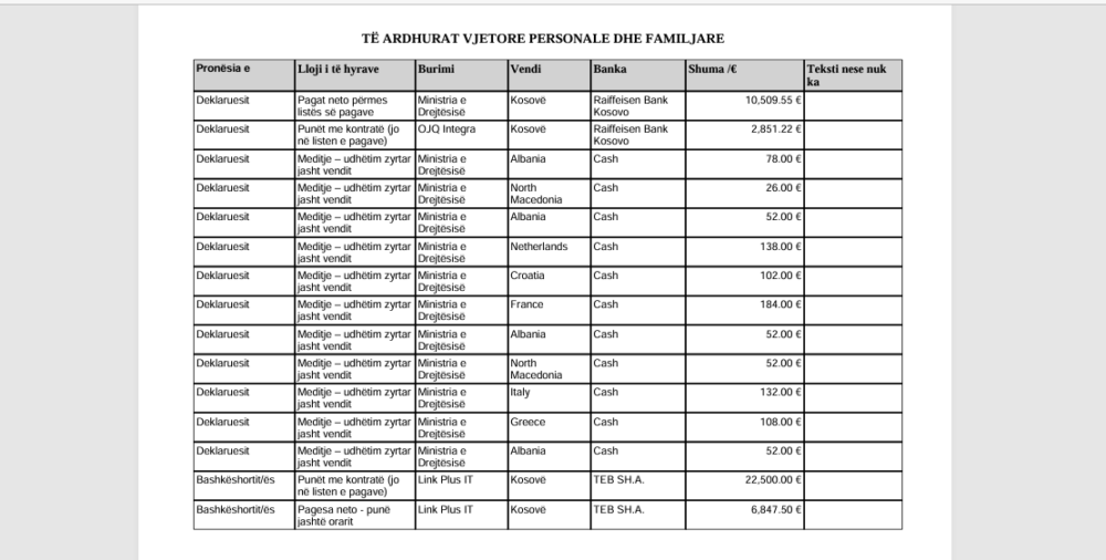 Në Regjistrin për Deklarimin e Pasurisë të vitit 2024, Berita Abazi kishte pranuar 2 mijë e 851 euro e 22 centë, ku burimi thotë “OJQ Integra”.