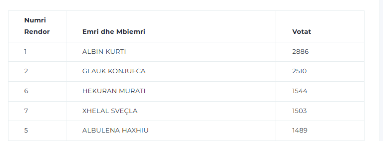 Më i votuari është kandidati për kryeministër, Albin Kurti, ku deri tani ka marrë 2 mijë e 886 vota.