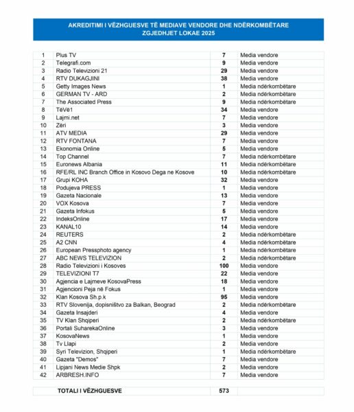 Po ashtu, KQZ mori vendim për akreditimin e grupit të parë të vëzhguesve të mediave vendore dhe ndërkombëtare për Zgjedhjet Lokale 2025. Sipas vendimit të KQZ-së, akreditohen 29 media vendore dhe 13 të tjera ndërkombëtare, me numër të përgjithshëm të përfaqësuesve: 573.