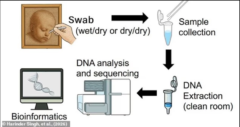 Studiuesit fërkuan butësisht vizatimin Holy Child me një tampon të ngjashëm me ato të testeve COVID-19 për të kapur çdo gjurmë të ADN-së.