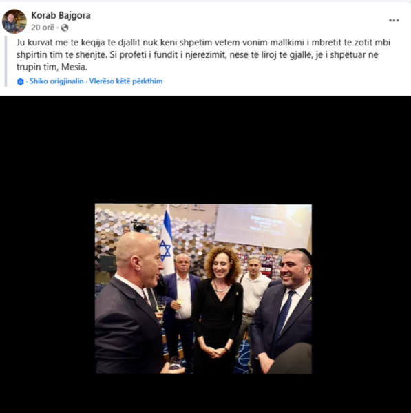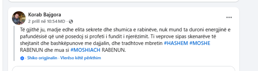 “Mbreti i madh #HASHEM është ARGUMENTI im. Me një argument të bazuar në parajsë kur jeta ime fizike është në rrezik #TORAH është TESTAMENTI im. Prej qe MOSHE RABENU me shkrujti si profeti i fundit i njerzimit, komandantat e kosoves ne krye me Ramush Hardinaj, qe eshte dajallar kane perdor institucionet shtetrore per me vra jashte ne liri dhe brenda burgut, por ne vitin 2019, kur me erdhi profecia, i thash MUHAMET HALITITIT, psikologu i cili tash i tha XHAVIT HALITIT se KADRI VESLIT tregoi se komuniteti hebre në KOSOVË i ka gjetur gjurmët e mia, më ka lëshuar por hebrenjtë u munduan të manipulojnë në mënyrë psiqike që ta marrin pasardhësin tim dhe ta sjellin në IZRAEL për ta mashtruar popullin hebre se MESIA ka lindur në IZRAEL. me respekt rabini i madh #MOSHIACH RABENU #INFINITY nga KOSOVA”, ka shkruan ai.