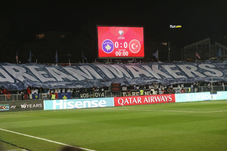 Grupi i tifozëve “Dardanët” ka shpalosur një koreografi të madhe me mbishkrimin “Dream Makersers”, në mbështetje të lojtarëve të Kosovës, duke e kthyer stadiumin në një spektakël të vërtetë.