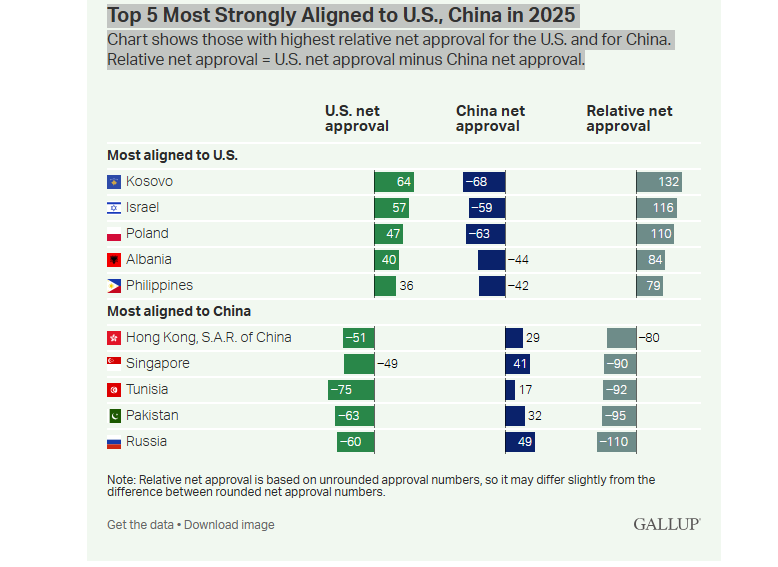 Nga ana tjetër, Rusia, Pakistani, Tunizia, Singapori dhe Hong Kongu tregojnë përafrimin më të fortë relativ me Kinën, megjithëse, në mënyrë të dukshme, preferencat e tyre pasqyrojnë negativitet të thellë ndaj SHBA-së më shumë sesa entuziazëm të fortë për Kinën.