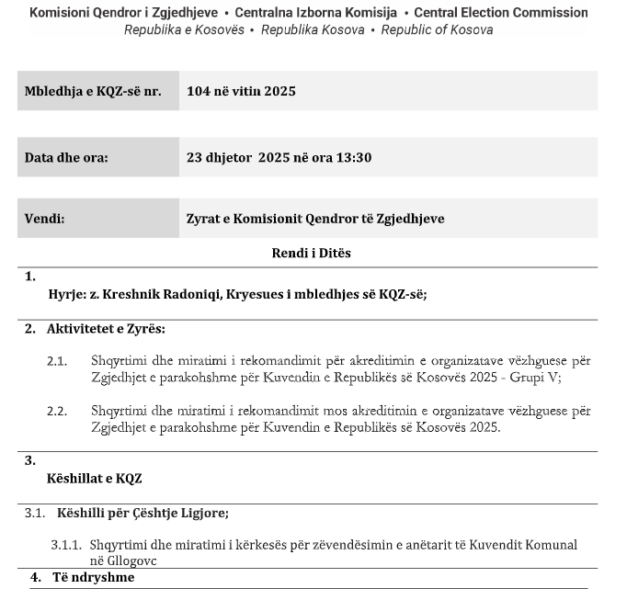 Komisioni Qendror i Zgjedhjeve do të mbajë mbledhje sot nga ora 13:30.