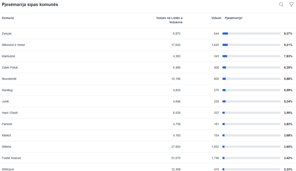 Komisioni Qendror Zgjedhor ka publikuar platformën elektronike për publikimin e rezultateve preliminare dhe statistikave për pjesëmarrjen në votime për çdo komunë, qendër votimi dhe vendvotim.