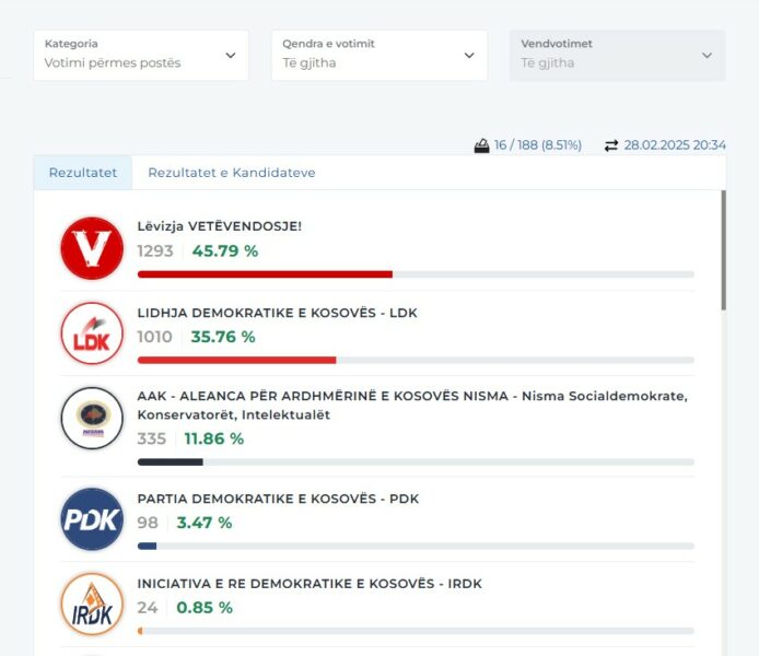 Pas procesimit të 8.51% të votave (16 nga 188 kuti), Lëvizja Vetëvendosje kryeson me 1,293 vota (45.79%), e ndjekur nga Lidhja Demokratike e Kosovës (LDK) me 1,010 vota (35.76%).