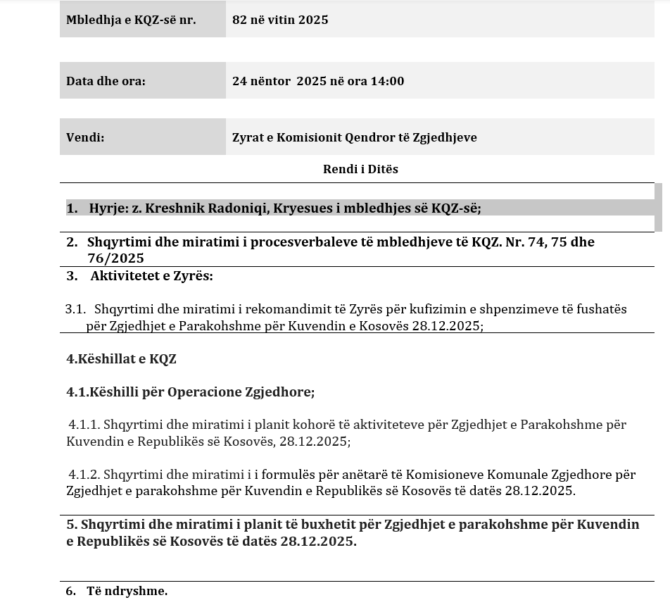 Në rend dite janë edhe disa pika të tjera procedurale që lidhen me përgatitjet teknike dhe administrative për mbarëvajtjen e zgjedhjeve.