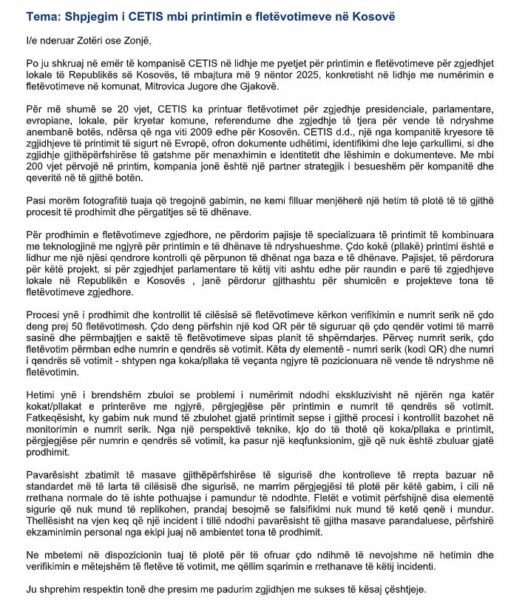 “Hetimi ka zbuluar se problemi ka ndodhur vetëm në një nga katër kokat e printerit që shtyp numrin e vendvotimit, përderisa sistemi i kontrollit monitoron vetëm numrin serik (QR kodin), ndaj gabimi nuk është detektuar gjatë shtypjes. CETIS thekson se merr plotësisht përgjegjësinë për këtë gabim teknik, duke nënvizuar se fletëvotimet përmbajnë elemente të shumta sigurie që e bëjnë të pamundur falsifikimin ose kopjimin e tyre. Kompania shpreh keqardhje të thellë për incidentin dhe konfirmon se mbetet në dispozicion të plotë të KQZ-së për çdo ndihmë në hetimin dhe verifikimin e fletëvotimeve për të sqaruar rrethanat e rastit”, thuhet në komunikatë.