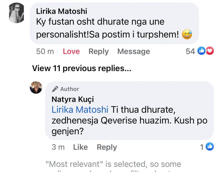 “Ky fustan është dhuratë nga unë personalisht. Sa postim i turpshëm” , ka komentuar Matoshi në një postim të zyrtares së PSD’së, Natyra Kuçit.