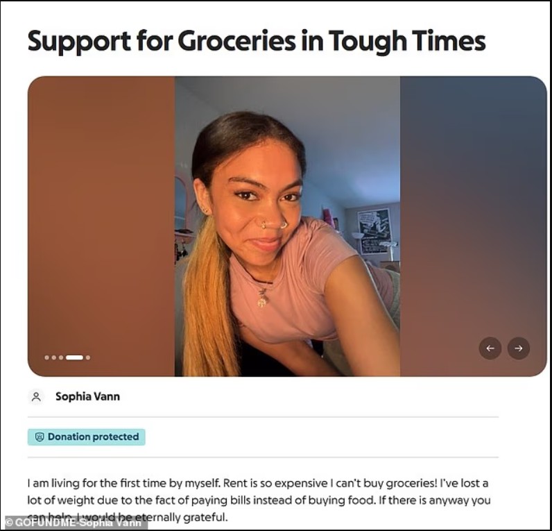 Sophia Vann nga Carolina e Veriut shpjegoi: “Po jetoj për herë të parë vetë. Qiraja është kaq e shtrenjtë sa nuk mund të blej ushqime! Kam humbur shumë peshë sepse paguaj faturat në vend të ushqimit. Çdo ndihmë do të ishte e çmuar pafund.”