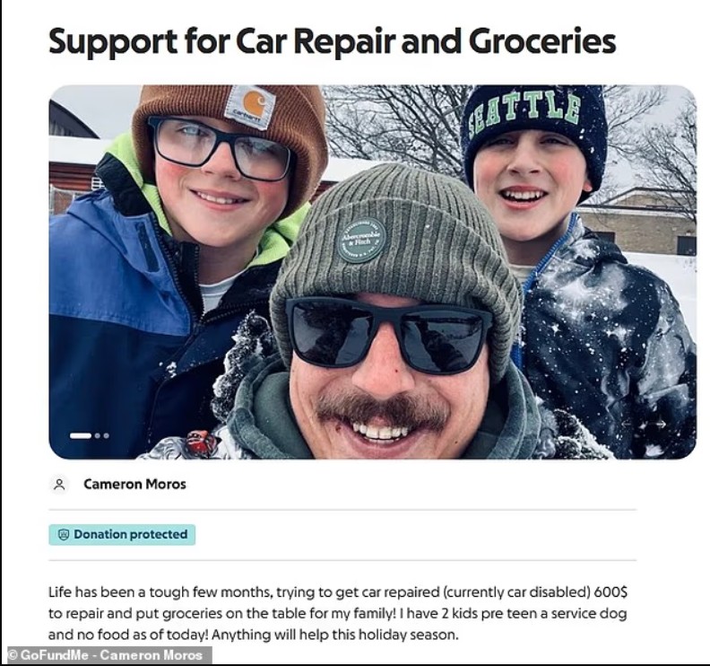 Cameron Moros nga Pensilvania kërkon ndihmë për të mbajtur familjen: “Jeta ka qenë e vështirë këto muaj, duke u munduar të riparoj makinën (aktualisht e fikur), 600 dollarë për riparimin dhe të vendos ushqime në tavolinë për familjen time! Kam dy fëmijë para-adoleshentë, një qen shërbimi dhe sot nuk kemi ushqim!”
