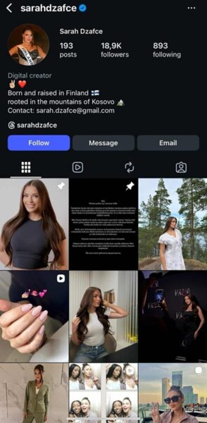 Dzafce në Instagramin e saj e ka të shkruar se origjina e saj është nga Kosova.