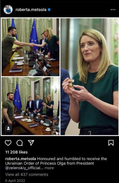 Një fotografi e publikuar nga Presidentja e Parlamentit Evropian, Roberta Metsola, ku ajo shihet bashkë me Presidentin e Ukrainës, Volodymyr Zelensky dhe në sfond të tyre është fotografia e Presidentit Historik të Kosovës, Ibrahim Rugovës, është bërë fotografia me më së shumti pëlqime në faqet e udhëheqëses së PE’së, raporton Express.