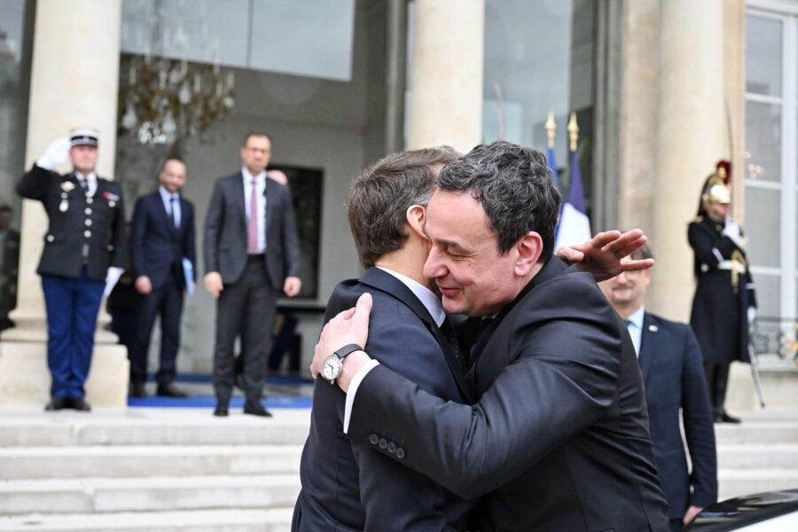 Macron dhe Kurti kanë shtrënguar duart dhe janë përqafuar me njëri-tjetrin gjatë përshëndetjes.