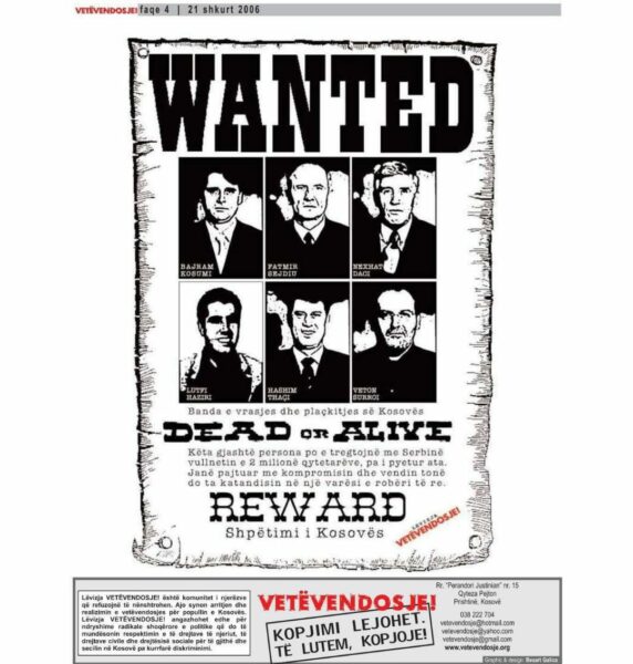 “Këta gjashtë persona po e tregtojnë me Serbinë vullnetin e 2 milionë qytetarëve, pa i pyetur ata. Janë pajtuar me kompromisin dhe vendin tonë do ta katandisin në një varësi e robëri të re”, shkruante në këtë poster.
