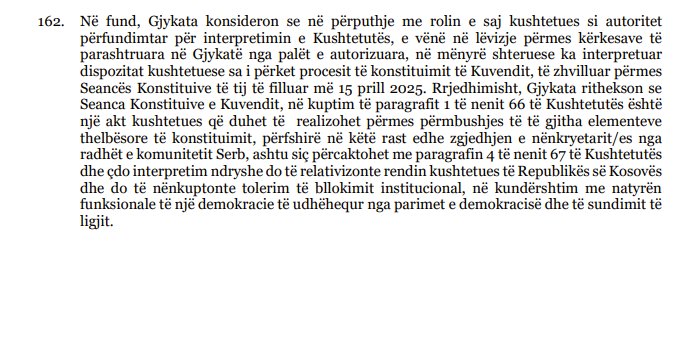 “Në fund, Gjykata konsideron se në përputhje me rolin e saj kushtetues si autoritet përfundimtar për interpretimin e Kushtetutës, e vënë në lëvizje përmes kërkesave të parashtruara në Gjykatë nga palët e autorizuara, në mënyrë shteruese ka interpretuar dispozitat kushtetuese sa i përket procesit të konstituimit të Kuvendit, të zhvilluar përmes Seancës Konstituive të tij të filluar më 15 prill 2025. Rrjedhimisht, Gjykata rithekson se Seanca Konstituive e Kuvendit, në kuptim të paragrafit 1 të nenit 66 të Kushtetutës është një akt kushtetues që duhet të realizohet përmes përmbushjes të të gjitha elementeve thelbësore të konstituimit, përfshirë në këtë rast edhe zgjedhjen e nënkryetarit/es nga radhët e komunitetit Serb, ashtu siç përcaktohet me paragrafin 4 të nenit 67 të Kushtetutës dhe çdo interpretim ndryshe do të relativizonte rendin kushtetues të Republikës së Kosovës dhe do të nënkuptonte tolerim të bllokimit institucional, në kundërshtim me natyrën funksionale të një demokracie të udhëhequr nga parimet e demokracisë dhe të sundimit të ligjit”, thuhet në pikën 162 të aktgjykimit./Express/