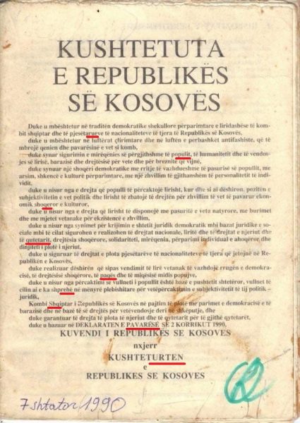 Kryetari i Lëvizjes “Vetëvendosje”, Albin Kurti, e ka publikuar një fotografi ku shihet faqja e parë e Kushtetutës së Kosovës, e cila është miratuar më 7 shtator të vitit 1990. Në këtë faqe mund të vërehen nëntë gabime drejtshkrimore.