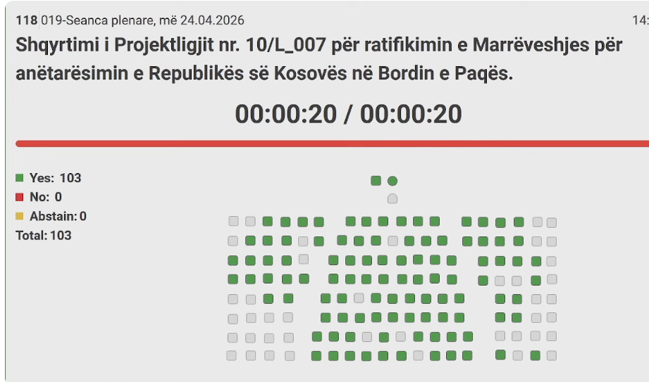 Me 103 vota “për” është miratuar “Projektligji 10L-007 për ratifikimin e Marrëveshjes për anëtarësimin e Kosovës në Bordin e Paqes.