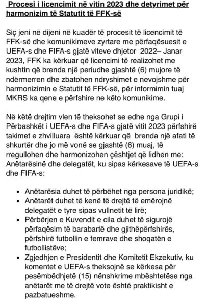Dokumentet tregojnë se licencimi i FFK-së në vitin 2023 është dhënë me kusht, pas komunikimeve zyrtare me UEFA-n dhe FIFA-n gjatë periudhës dhjetor 2022 – janar 2023.
