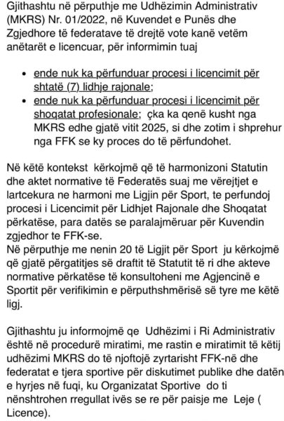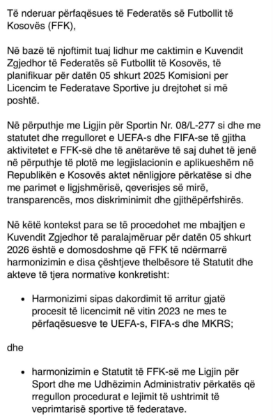 Federata e Futbollit të Kosovës (FFK) ka planifikuar mbajtjen e Kuvendit Zgjedhor më 5 shkurt, mirëpo dokumente zyrtare të Komisionit për Licencimin e Federatave Sportive pranë Ministrisë së Kulturës, Rinisë dhe Sportit (MKRS) ngrenë dyshime serioze mbi ligjshmërinë e këtij procesi.