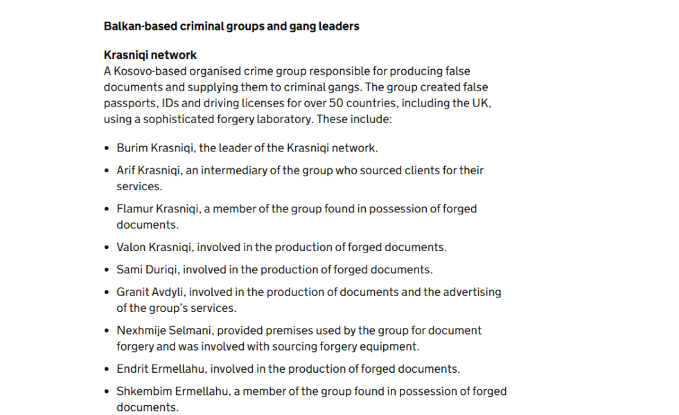 “ Konkretisht, ai ka përfituar financiarisht nga trafikimi i personave si anëtar i rrjetit KRASNIQI. Rrjeti KRASNIQI krijoi një laborator të sofistikuar falsifikimi në Kosovë, me pajisje për prodhimin e pasaportave, kartave të identitetit dhe patentave të drejtimit të falsifikuara ose të ndryshuara në mënyrë mashtruese për mbi 50 vende, përfshirë Mbretërinë e Bashkuar”, thekson dokumenti.