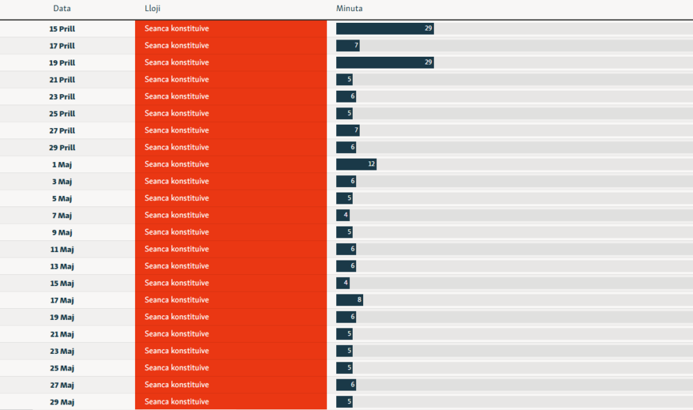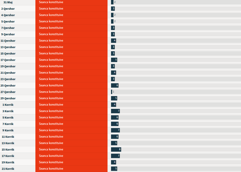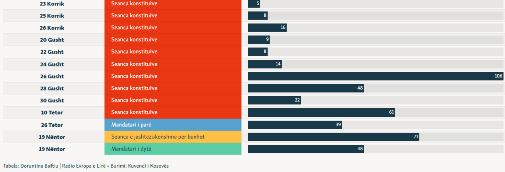 Deputetët e dalë nga zgjedhjet parlamentare të 9 shkurtit u takuan 63 herë në sallën e Kuvendit të Kosovës. Megjithatë, në rreth 750 minutat punë, ata nuk arritën të zgjedhin një Qeveri të re apo ta miratojnë buxhetin. Madje, iu deshën 60 seanca për ta konstituuar Kuvendin.