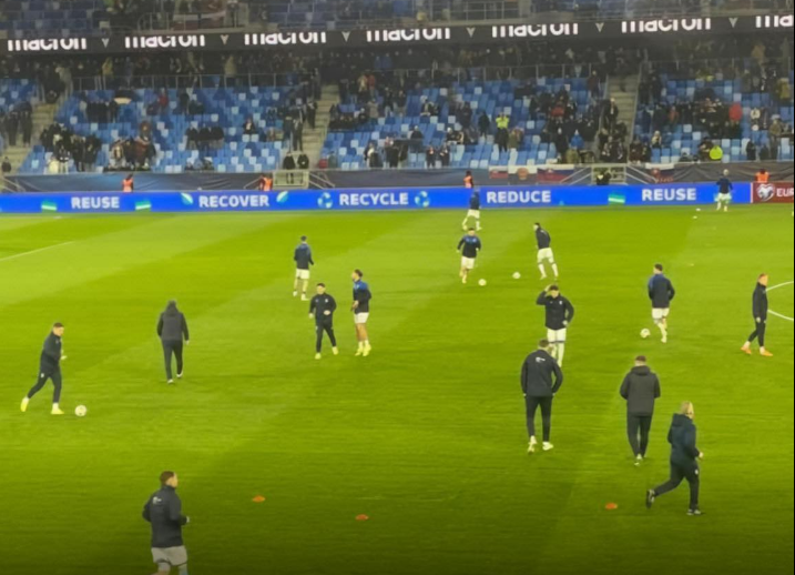 Futbollistët kosovarë zbresin në fushë për t’i kryer ngrohjet e nevojshme para duelit të madh që nis pas pak minutash.
