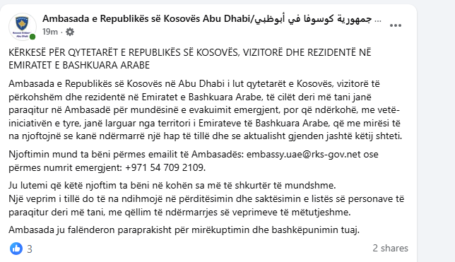 Ambasada e Republikës së Kosovës në Abu Dhabi përmes një njoftimi për media ka kërkuar nga qytetarët e Kosovës të cilët kanë qenë në Emirate Arabe dhe janë larguar me vetë-iniciativë, ta lajmërojnë Ambasadën.