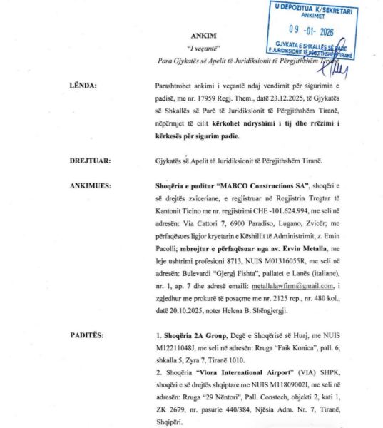 Shoqëria zvicerane “MABCO Constructions SA”, e lidhur me biznesmenin Emin Pacolli, ka depozituar më 9 janar 2026 një “ankim të veçantë” në Gjykatën e Apelit të Juridiksionit të Përgjithshëm Tiranë, ku kërkon rrëzimin e masës së sigurimit të padisë që, sipas saj, ka paralizuar vendimmarrjen në shoqërinë koncesionare “Vlora International Airport” SHPK dhe, në praktikë, ka futur në ngërç punimet e aeroportit.