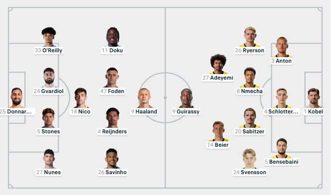 Skuadrat Manchester City dhe Borussia Dortmund kanë publikuar formacionet zyrtare për ndeshjen që zhvillohet në ora 21:00 në kuadër të xhiros së katërtë të fazës së ligës së Ligës së Kampionëve.