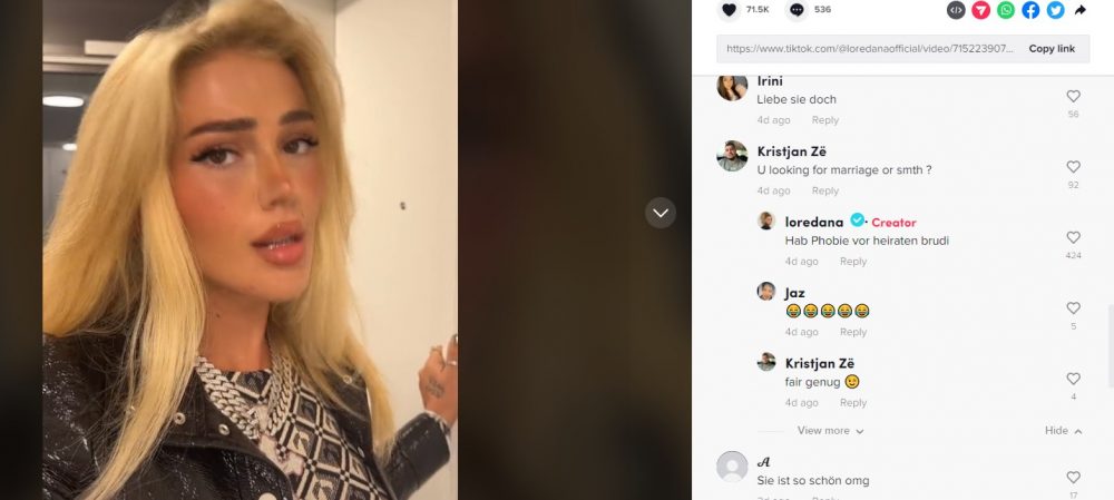 “Unë kam fobi nga martesa vëlla. Hall me burrë e hall pa burrë, hall të mos martohesh ti”, ka komentuar Loredana në një përgjigje në TikTok për një ndjekës të saj. /GazetaExpress/