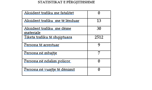 Po ashtu, është njoftuar për 43 aksidente trafiku, ku, 13 janë më të lënduar, kurse 30 janë me dëme materiale.