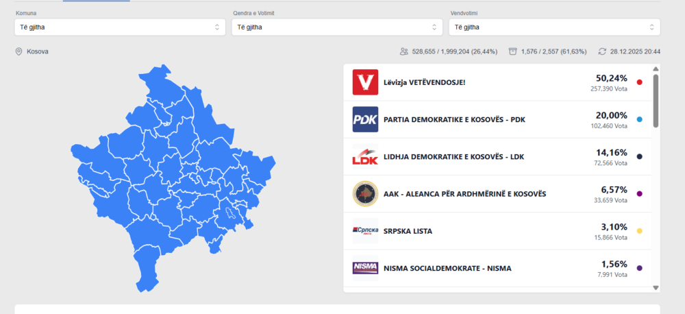 Deri më tani, nga 61,63% Lëvizja Vetëvendosje është duke prirë me 50,24%.