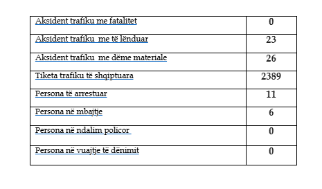 Gjatë kësaj kohe është raportuar të kenë ndodhur afër 50 aksidente trafiku, ku, 23 janë me të lënduar, dhe, 26 me dëme materiale.