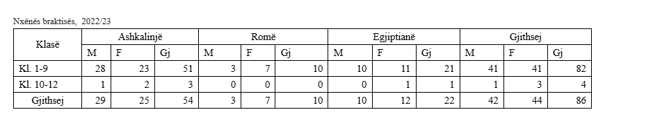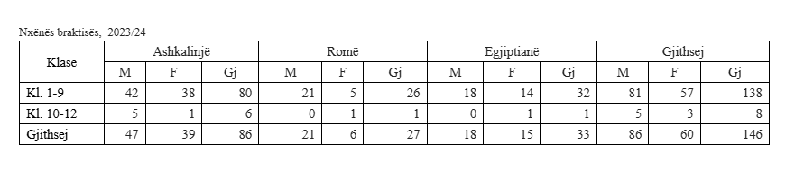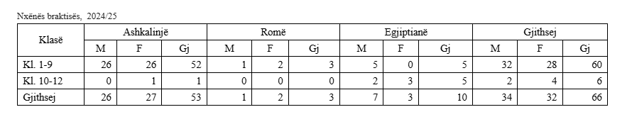 Të dhëna për braktisje të shkollës nga nxënësit e komuniteteve Ashkalinjë, Romë dhe Egjiptianë, në nivelet fillore dhe të mesme të lartë, sipas statistikave të Ministrisë së Arsimit Shkencës, Teknologjisë dhe Inovacionit, dërguar Gazetës Express, tregojnë se në vitin shkollor 2024/25, nga klasat 1-9 shkollimin braktisën 60 nxënës, ndërsa nga klasat 10-12 shkollimin braktisën 66 nxënës.