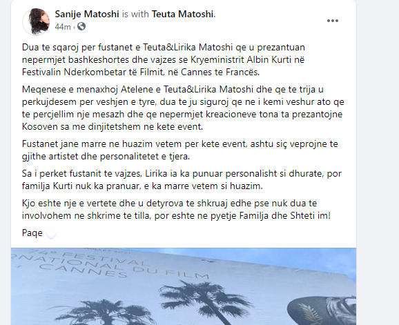 “Kryeministri ndodhet në Kanë në përkrahje të filmit kosovar dhe bashkëshortja e tij, ka huazuar dy fustanë për veten dhe fustanin me dredhëza për të bijën, të disenjuara nga kreatoret kosovare Teuta dhe Lirika Matoshi. Me t’u kthyer në Prishtinë fustanët do t’u kthehen kreatoreve”, kishte shkruar Kelmendi.