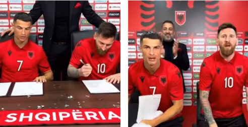 Një e tillë është edhe një video që po qarkullon në rrjetet sociale, më saktëisht në “Instagram”, ku shihen dy superyjet e futbollit, Lionel Messi dhe Cristiano Ronaldo duke ‘nënshkruar’ me kombëtaren e Shqipërisë.