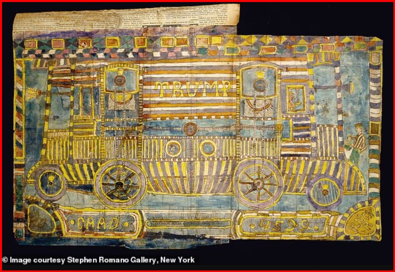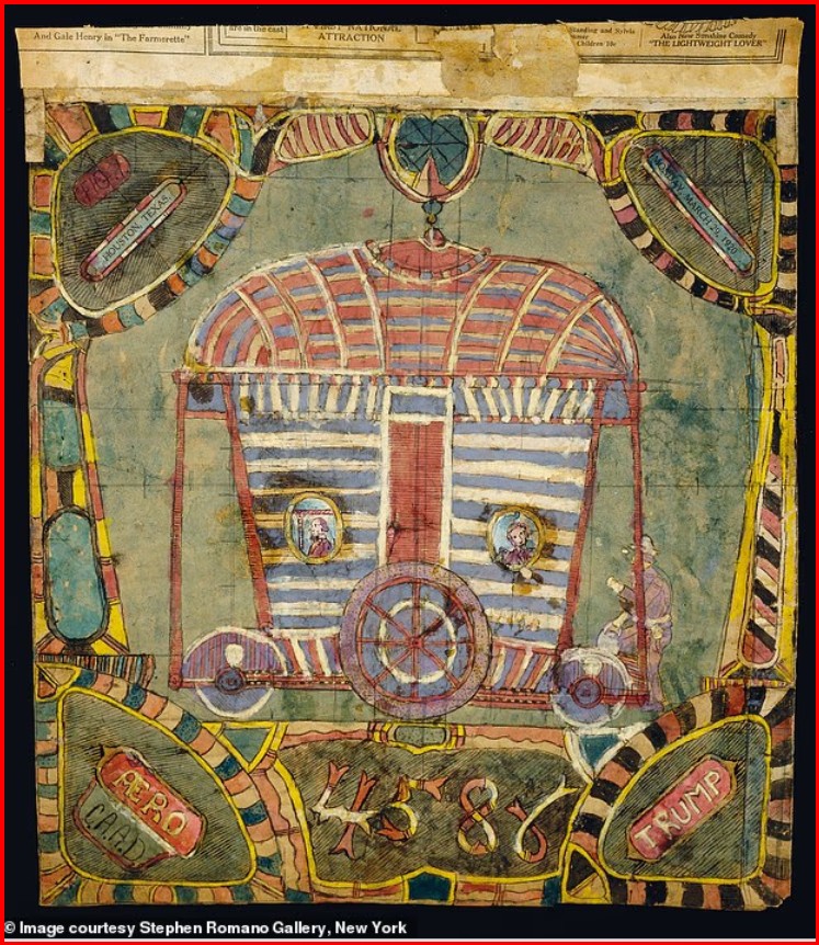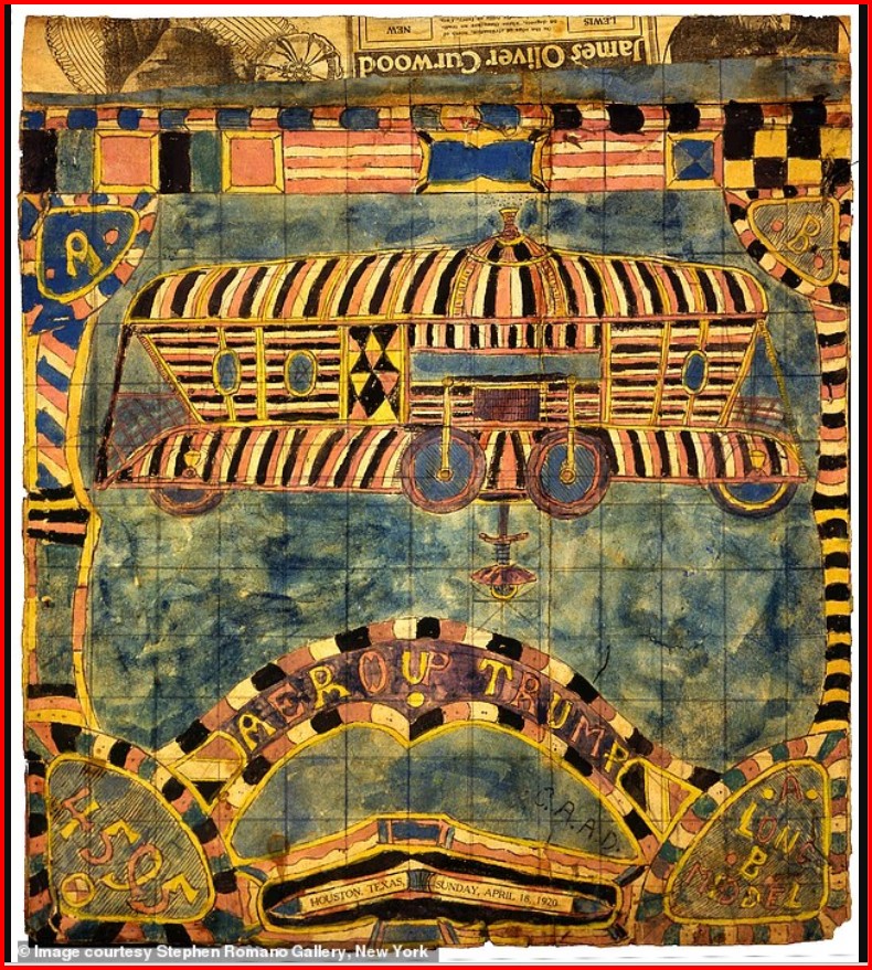 Dellschau krijoi para vdekjes vizatime të makinave fluturuese fantastike që i quante “aeros”, të ngjashme me një përzierje mes anijeve ajrore të hershme, balonave dhe aeroplanëve primitivë. Teoretikët e konspiracionit kanë vënë re shfaqjen e përsëritur të emrit të Trump dhe numrave që lidhen me mandatet e tij si presidenti i 45-të dhe i 47-të.
