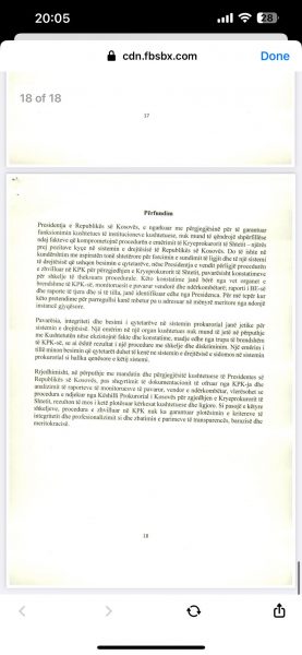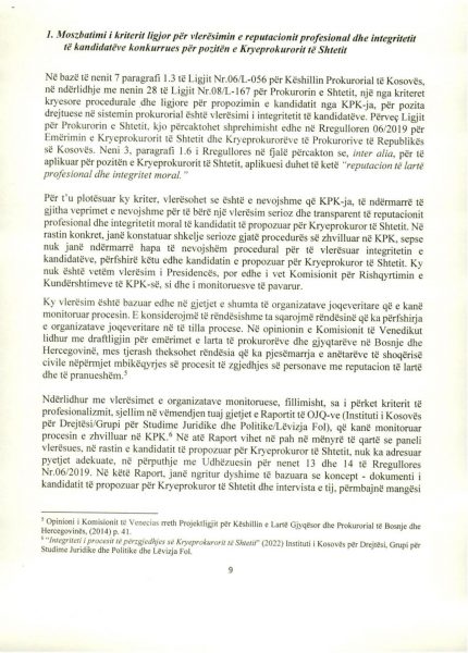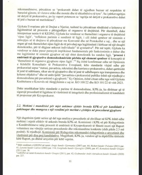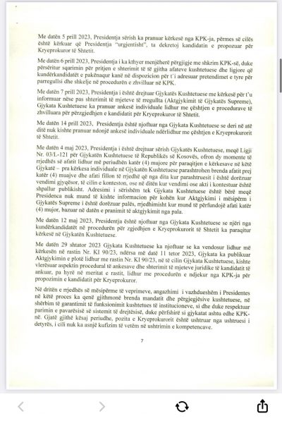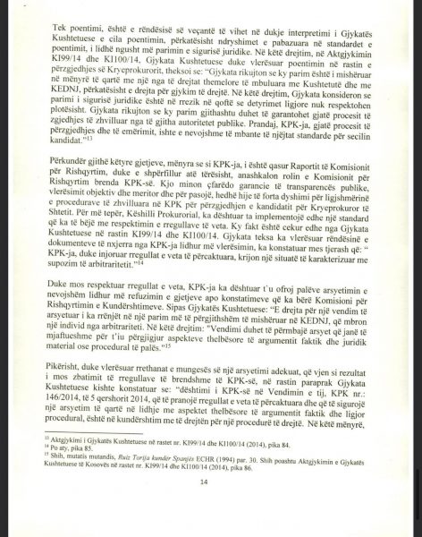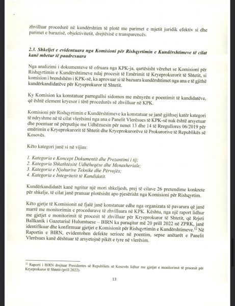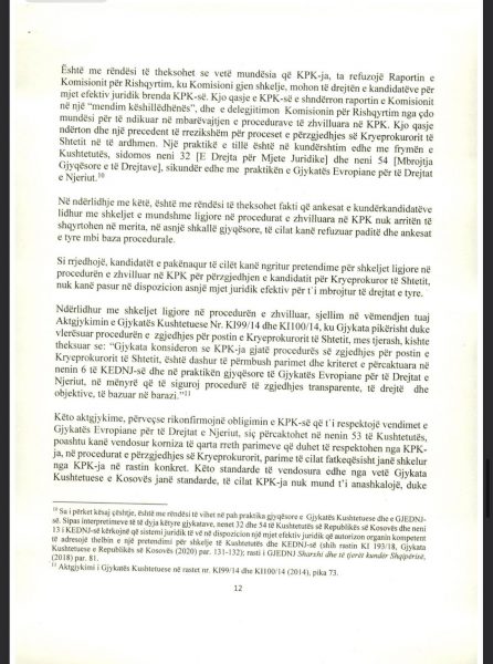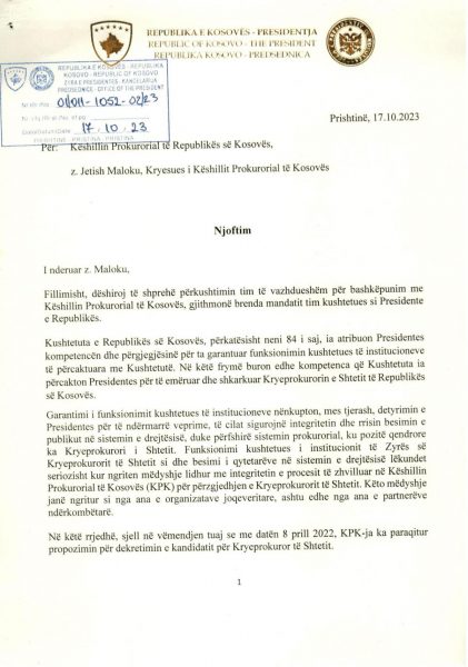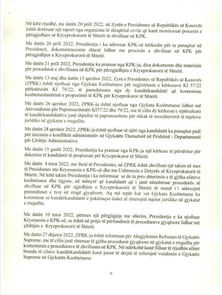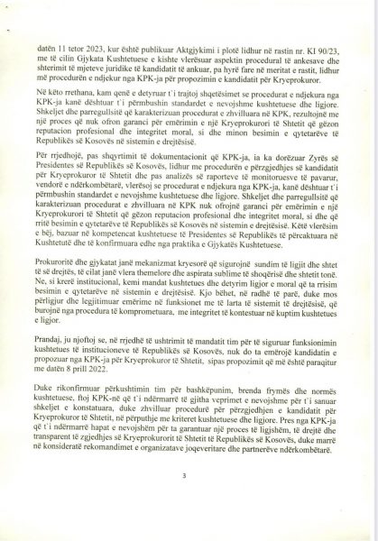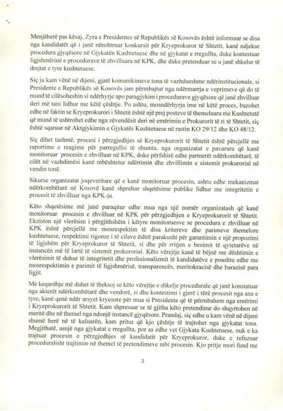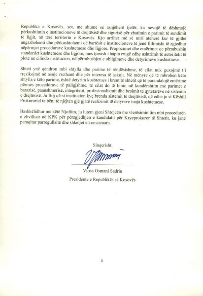 E Presidenca ua ka dërguar mediave për publikim edhe dokumentin 18 faqësh që Osmani ia ka dërguar Këshillit Prokurorial lidhur me këtë çështje, ku ndër të tjera thuhet se “procesi i përzgjedhjes së kryeprokurorit të shtetit është përcjellë me raportime e reagime për parregullsi të shumta, nga organizatat e pavarura që kanë monitoruar procesin e zhvilluar në KPK, duke përfshirë edhe partnerët ndërkombëtarë, të cilët në vazhdimësi kanë mbështetur ndërtimin dhe zhvillimin e sistemit prokurorial në vendin tonë”.