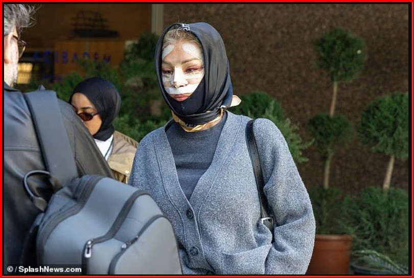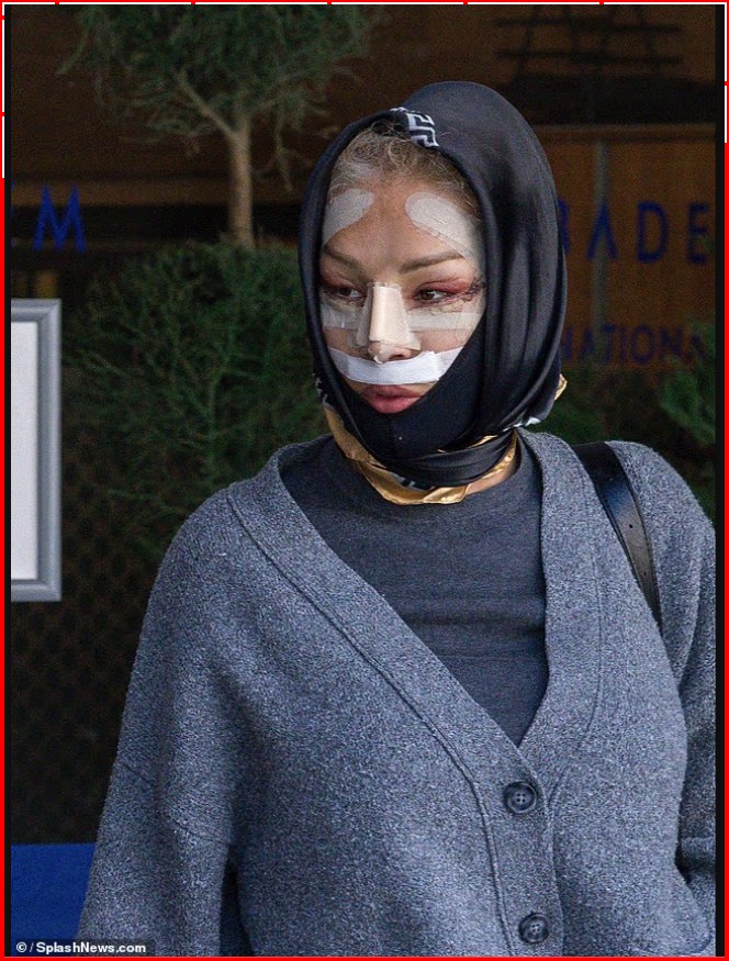 Fytyra e saj ishte e mbështjellë me një fashë mbështetëse të zezë, ndërsa hunda, buzët dhe balli ishin të mbuluara me fasha mbi lëkurën e mavijosur. Ndërhyrja vjen pasi vitin e kaluar Nadia humbi rreth 38 kilogramë, pas një operacioni për zvogëlimin e stomakut.
