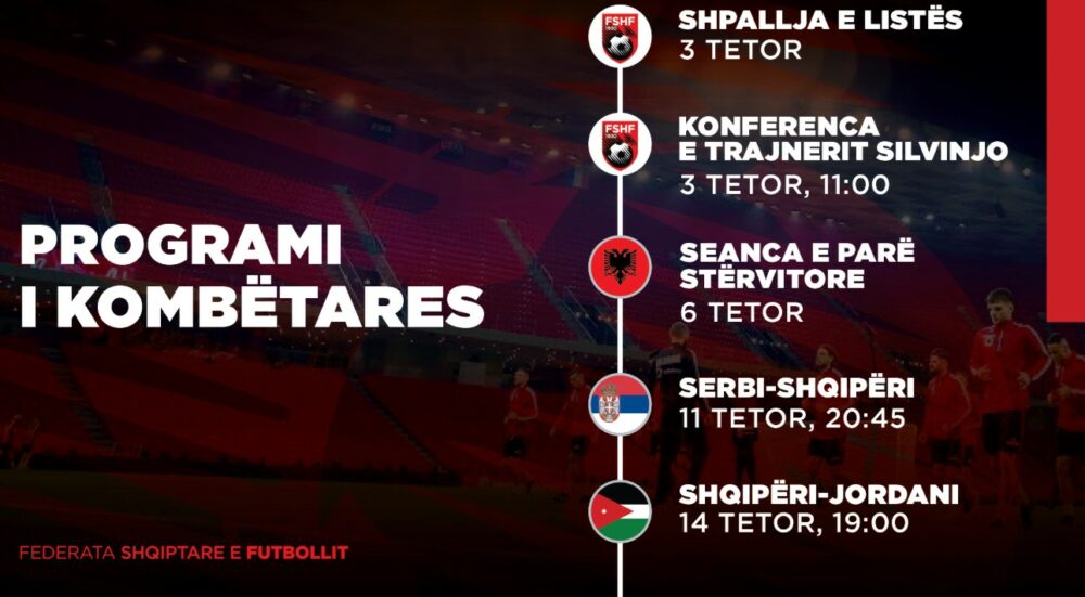 Ndërsa miqësorja Shqipëri – Jordani do të zhvillohet më 14 tetor, në stadiumin “Air Albania”, në orën 19:00.