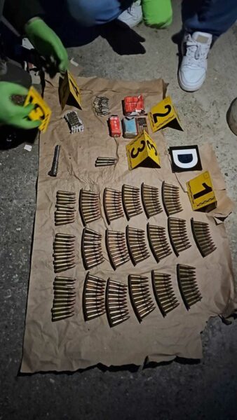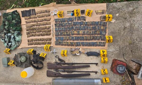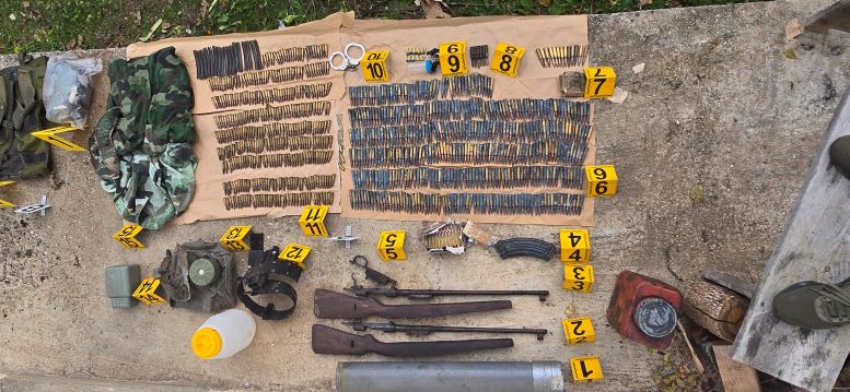 Uniformë ushtarake, pjesë të pushkëve të gjata, jelek taktik, gas maska, një tytë e pistoletës, një palë pranga dhe 1471 fishekë të kalibrave të ndryshëm.